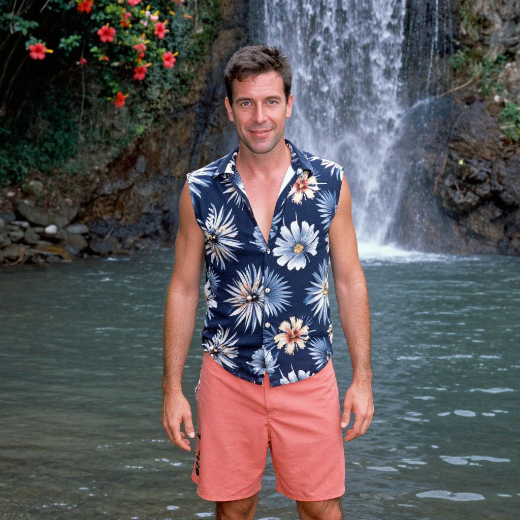 Photograph of a smiling Caucasian man with short brown hair standing in shallow water in front of a cascading waterfall. He wears a sleeveless, navy blue floral shirt with large white and orange flowers, and coral-colored board shorts. The background features lush greenery with red flowers, and the waterfall creates a misty effect. The water around him is clear, and his skin is lightly tanned. The overall scene is vibrant and tropical, with a focus on the man's relaxed, summery attire and the natural beauty of the waterfall setting.