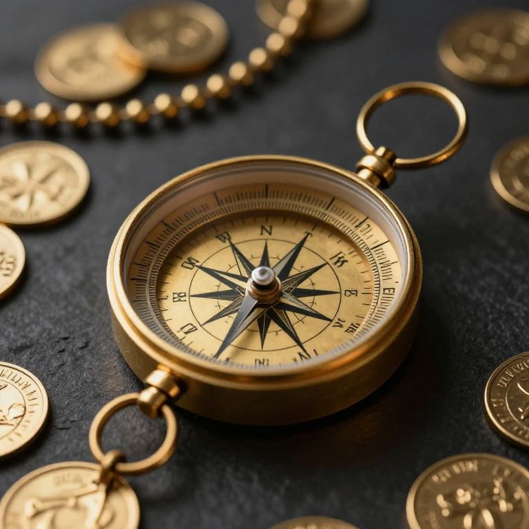 Photograph of a gold pocket compass with a clear glass cover, displaying a black needle and directional markings. The compass is connected by a gold ring to a beaded chain, both resting on a dark, textured surface. Scattered around the compass are several gold coins, slightly out of focus, adding a sense of depth. The compass's dial features numbers and cardinal directions, with the needle pointing slightly to the right. The overall lighting highlights the gold tones, creating a warm, nostalgic feel.