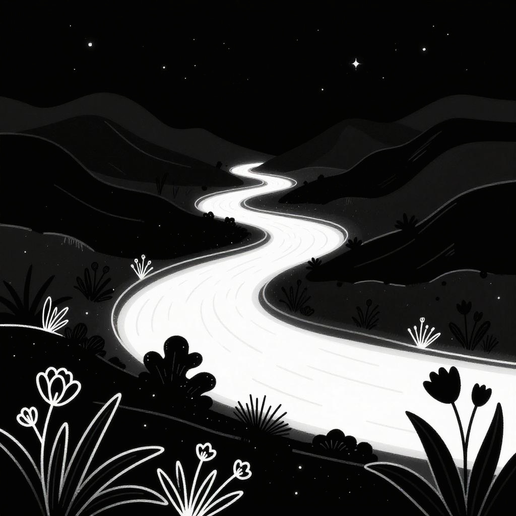 This is a black-and-white digital drawing of a nighttime landscape. A winding, glowing white river snakes through the center, surrounded by mountains and star-filled sky. The foreground features various plants and flowers, outlined in white against the dark background. The overall style is minimalist and stylized, with a strong contrast between the bright elements and the dark surroundings.