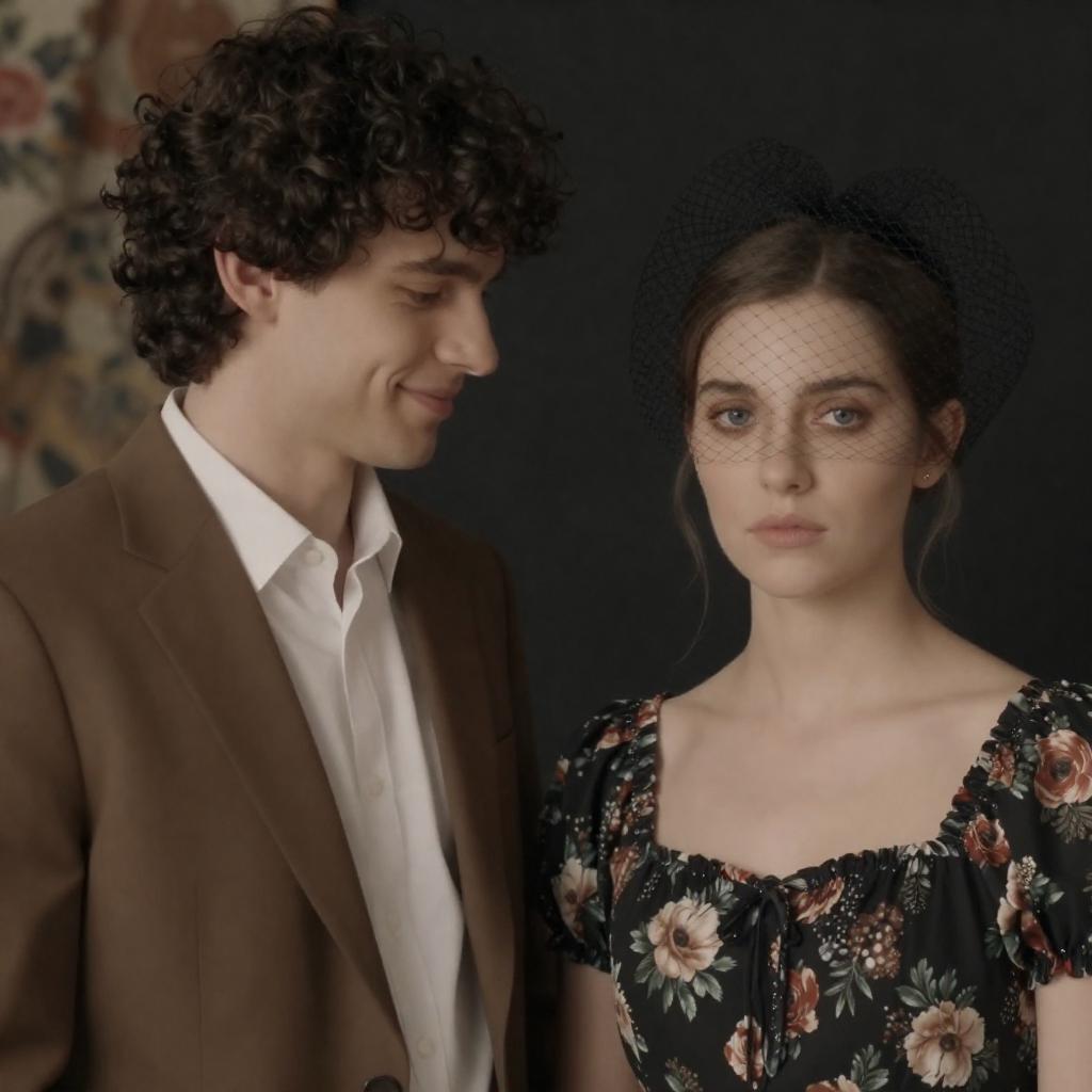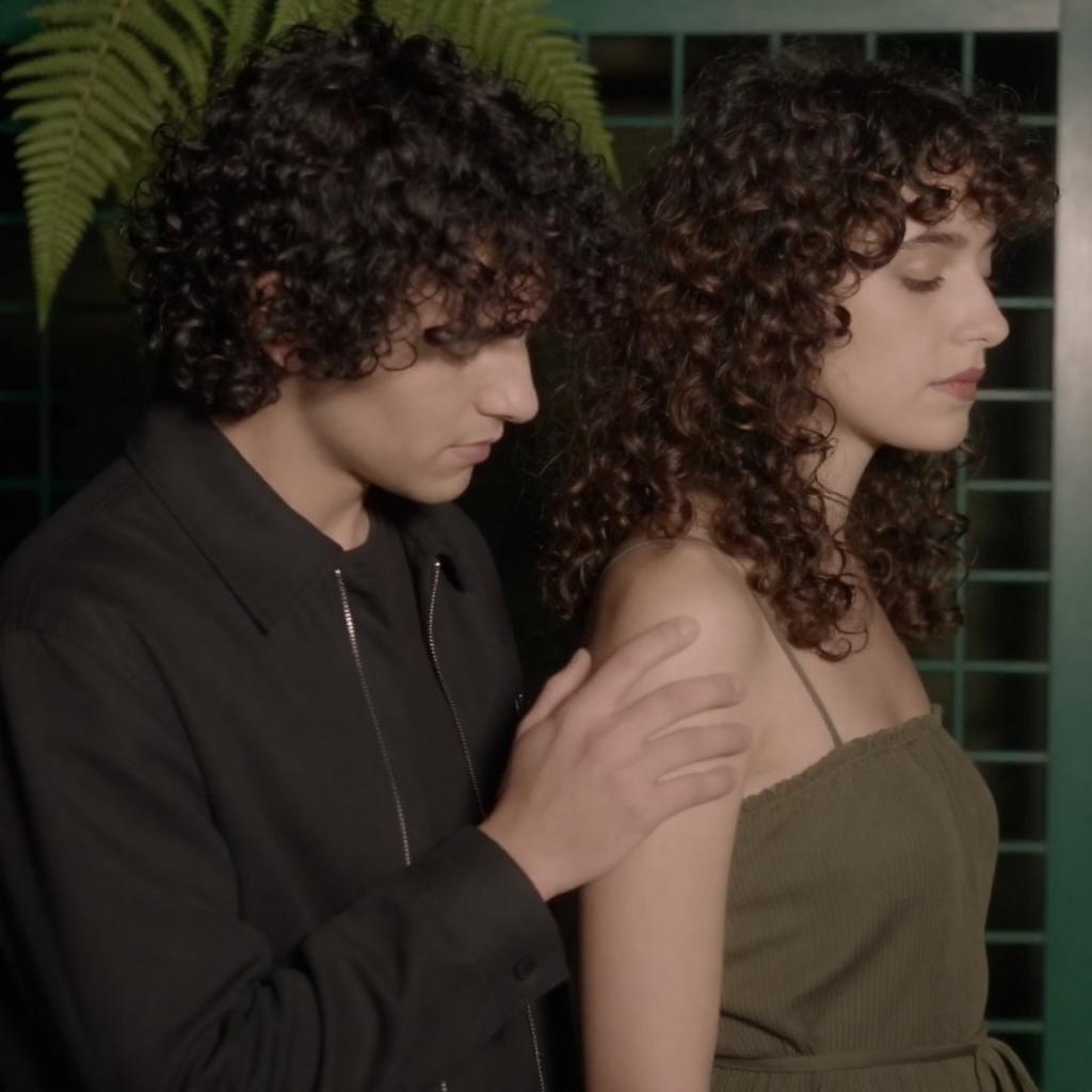 Photograph of a man and woman standing close, man with dark curly hair, black jacket, touching woman's bare shoulder, woman with curled brown hair, green dress, eyes closed, green metal grid and ferns in background. Man's head tilted down, woman's profile facing right. Intimate, dimly lit setting.