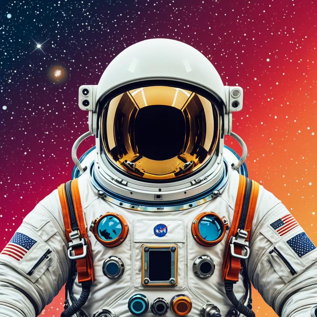 Illustration of an astronaut wearing a detailed white spacesuit helmet with American flag patches, set against a multicolor gradient starry space background. The image shows the spacesuit components with slight misalignment, depicted in a flat cartoon style.