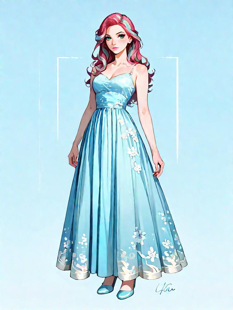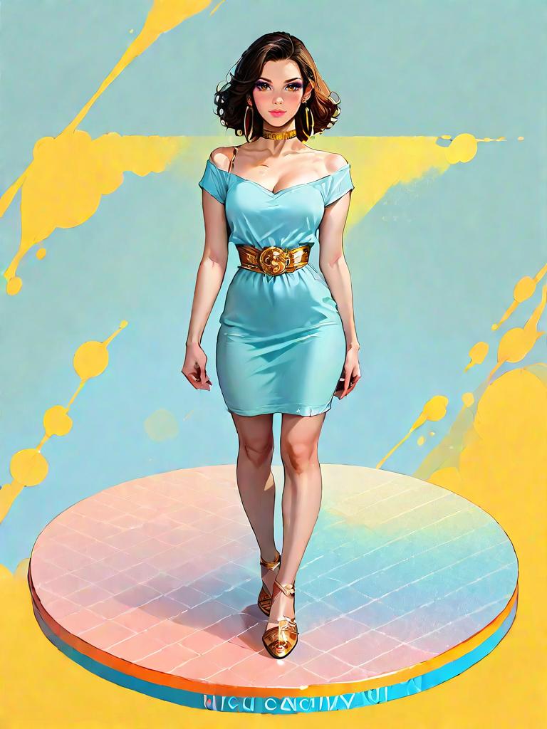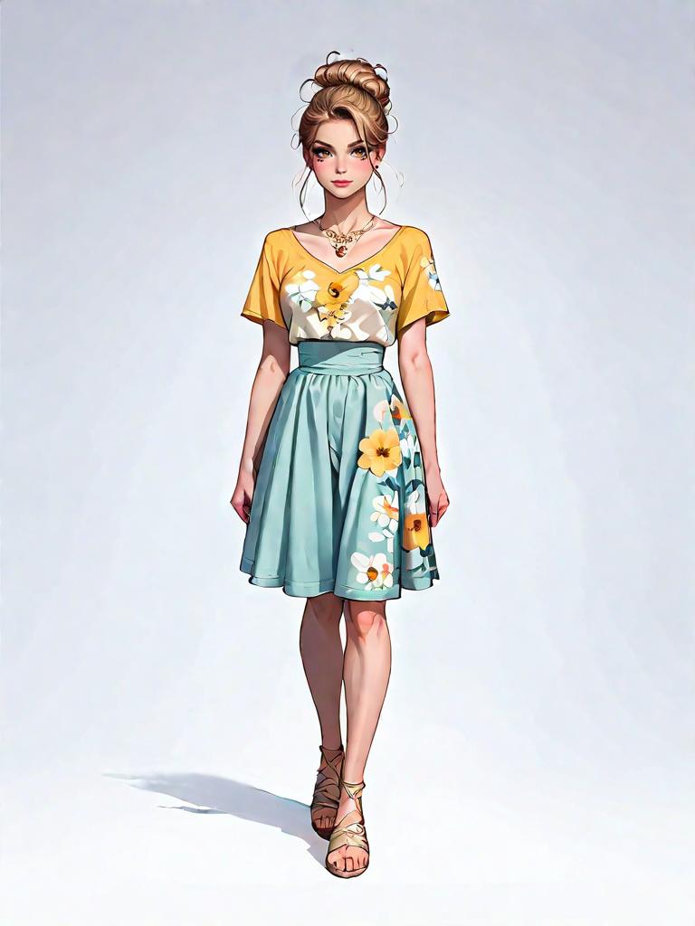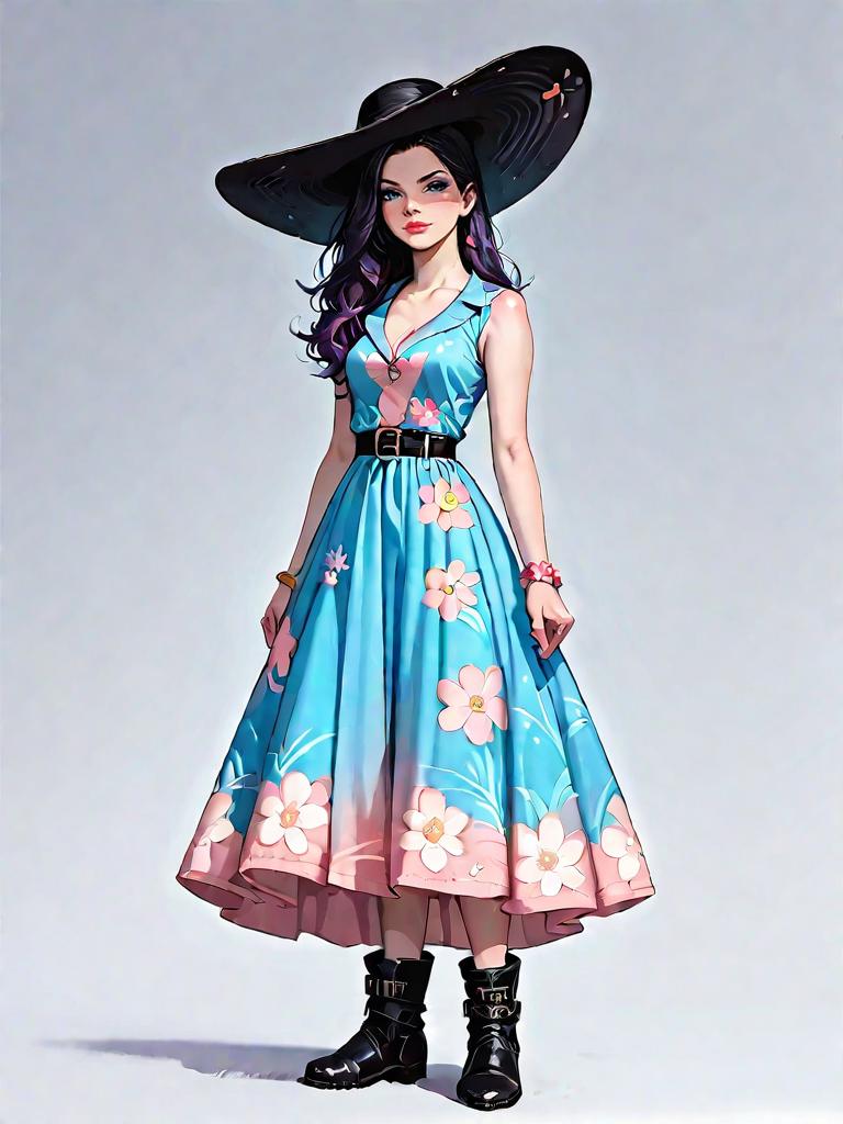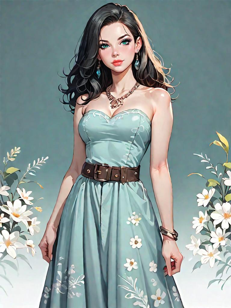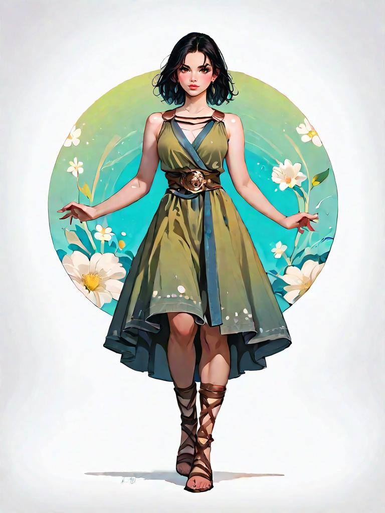 1girl, source_comics, realistic face, full body shot, Woman, bohemian, sleeveless asymmetrical dress with blue and white ethnic print, draped neckline, knee-length at shortest point, calf-length cascading hem, brown leather platform sandals, layered necklaces, minimal makeup.