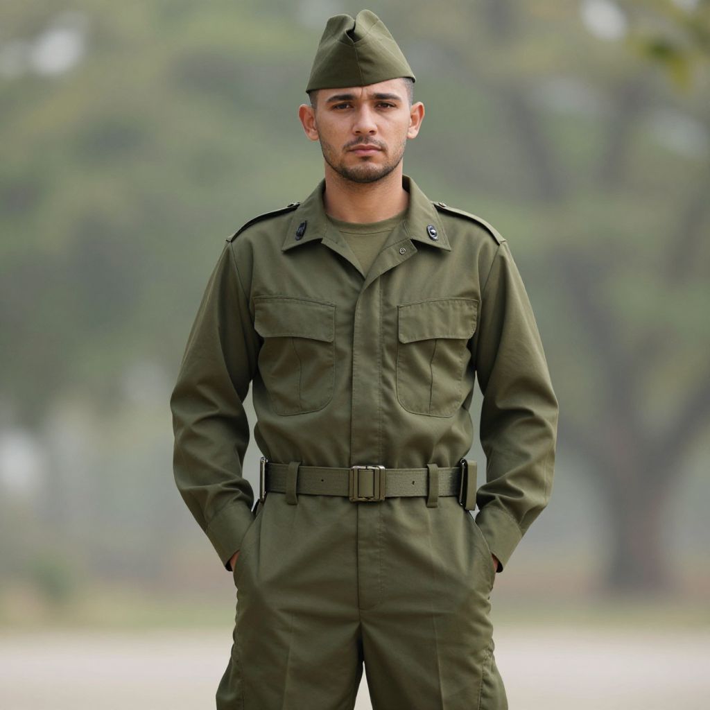 Photograph of a serious, young South Asian man in a green military uniform with a peaked cap, standing outdoors with hands in pockets, blurred trees in