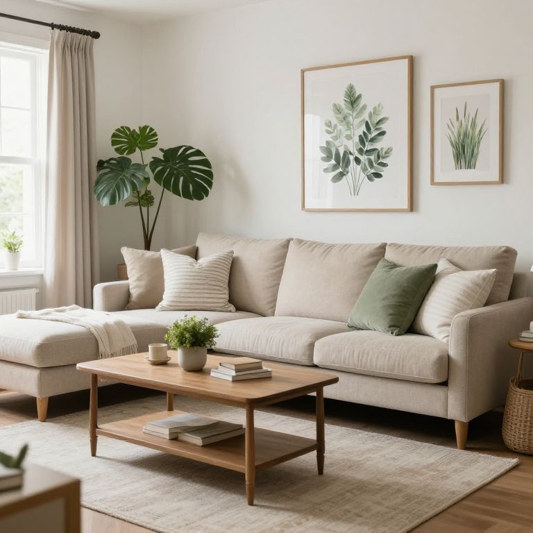 A cozy Coastal Shabby Chic living room features a neutral color palette with soft beige furniture, accented by greenery and botanical artwork, creating a serene and inviting atmosphere with vintage charm and natural lighting.