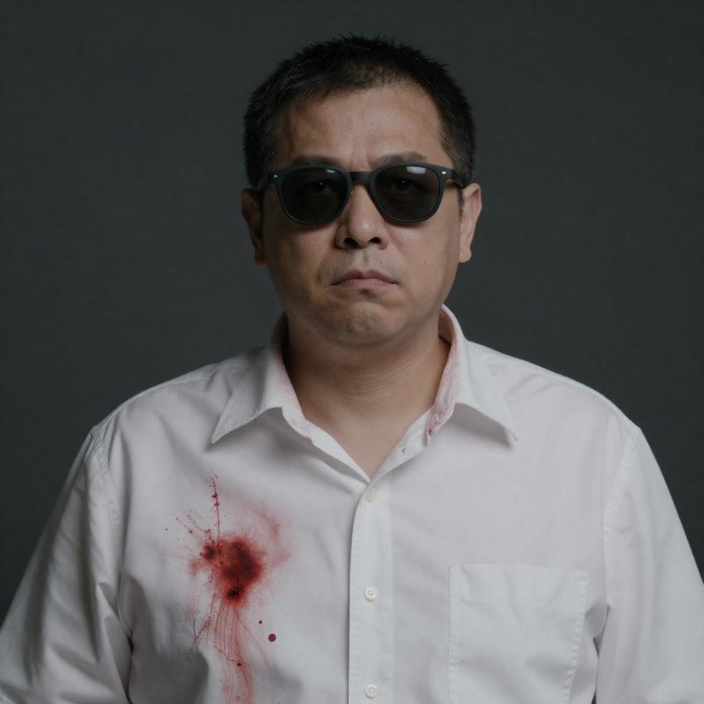 Photograph of three men applying fake blood to the faces of two older men with gray hair. The older men have blood smeared on their faces. The man in the center has a patterned shirt, the man to the right wears glasses and a black shirt, and the man behind them holds the face of the man on the right. Background has red and brown curtains.