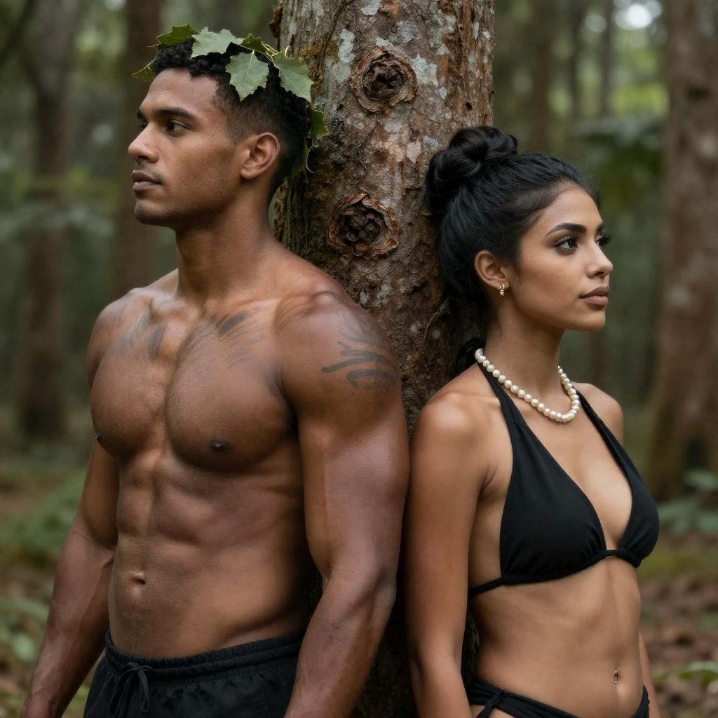 Photograph of a forest scene with a shirtless, muscular man with long red hair and black loincloth walking ahead of a woman with long black hair, wearing a black crop top and skirt. They stand in a shallow, rocky stream with fallen branches overhead. The woman looks forward, while the man looks slightly to the side.