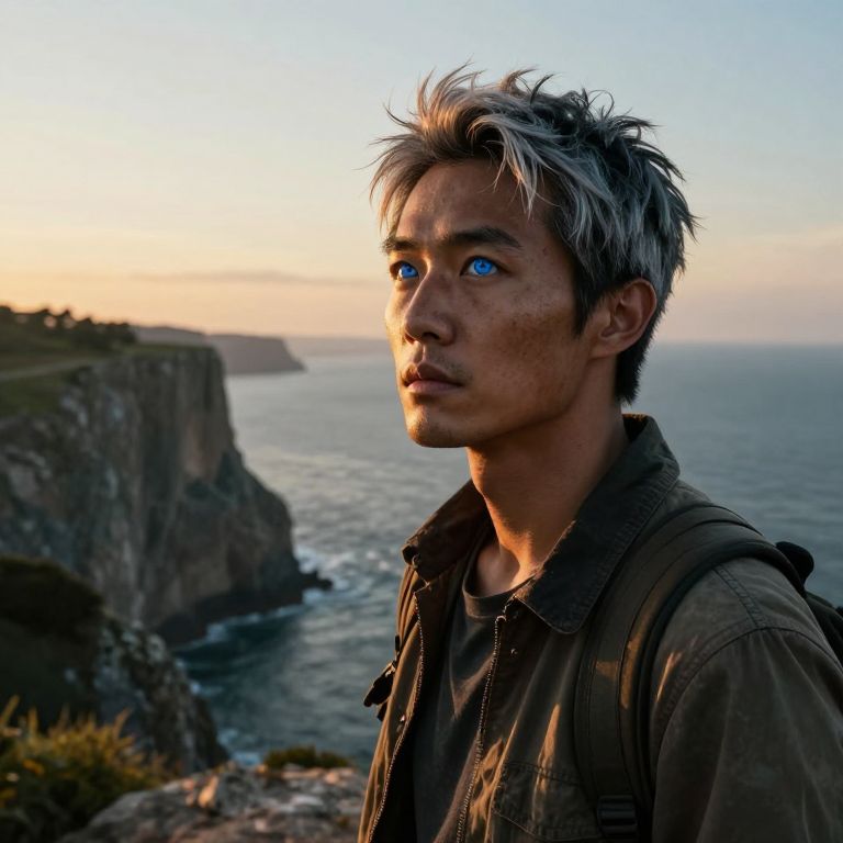 A photorealistic portrait captures an enigmatic East Asian explorer with piercing blue eyes and silver-streaked short hair. Illuminated by the golden setting sun, they stand at a rugged cliff's edge overlooking an expansive ocean. The background showcases rolling hills and distant mountain ranges, evoking adventure and solitude. This unusual low-angle perspective emphasizes their contemplative gaze and weathered face, creating an emotional depth that resonates with courage and introspection.