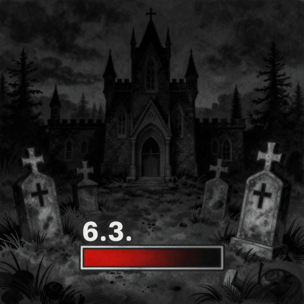 Digital drawing in a dark, gothic style depicts a spooky, shadowy Gothic cathedral with pointed spires and a large arched entrance, set against a cloudy, night sky. Two grave markers with crosses are positioned on either side of a grassy path leading to the cathedral. The foreground features tall grass and eerie shadows. A health bar at the bottom shows "6.3" with a red gradient bar. The overall mood is ominous and foreboding, with high contrast between the dark background and the white text. The scene suggests a horror or survival game setting.