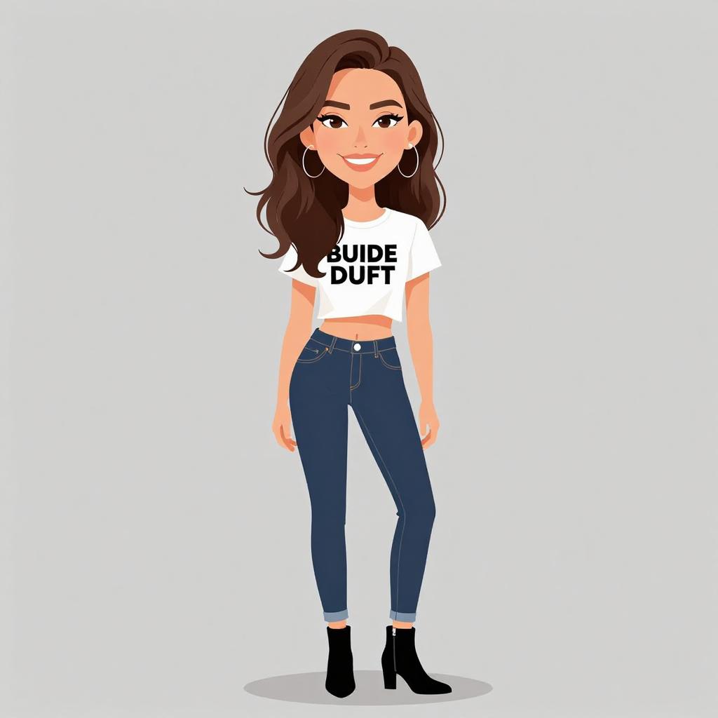 This digital cartoon illustration depicts a smiling young woman with long, wavy brown hair and fair skin. She wears a white, cropped t-shirt with the bold black text "SIDE DUFF" across the chest, exposing a small section of her midriff. Her outfit includes tight, dark blue jeans with subtle stitching details and black ankle boots with a slight heel. She also wears large silver hoop earrings. The background is plain white, making the character the focal point. The illustration style is clean and modern with bright, solid colors and simple shading.