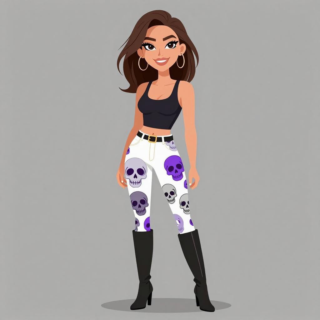 Digital illustration of a confident woman with light brown skin and long, dark brown hair. She wears a black, sleeveless crop top, white leggings adorned with purple and black skull patterns, and black knee-high boots. Large hoop earrings dangle from her ears, and she stands against a plain gray background. Her expression is friendly with a slight smile. The style is cartoonish with bold lines and vibrant colors, emphasizing her edgy, modern look.