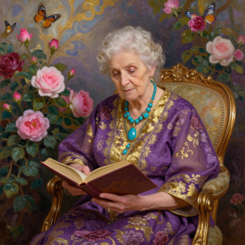 Elderly woman with white curly hair, wearing purple floral robe and turquoise necklace, reads book surrounded by roses and butterflies.