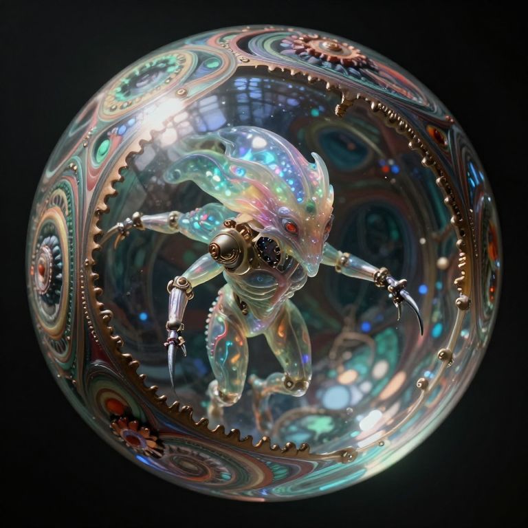 A surreal digital art composition depicts an enigmatic creature ascending from within a colossal, intricately patterned multi-colored sphere. Seen from above, this unique being displays an ethereal fusion of organic and mechanical aspects, provoking both fascination and apprehension. The creature's translucent flesh glimmers with iridescent hues, mirroring the captivating designs on the inner surface of its glass-like refuge, while pointed metallic limbs extend and retract like living gears. As light filters through the sphere, casting dappled shadows across the scene, it generates an emotional spectrum ranging from awe to curiosity, enticing the observer to delve into the intricate allure and unsettling mystery within.