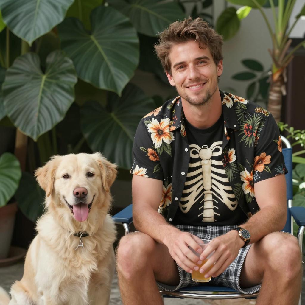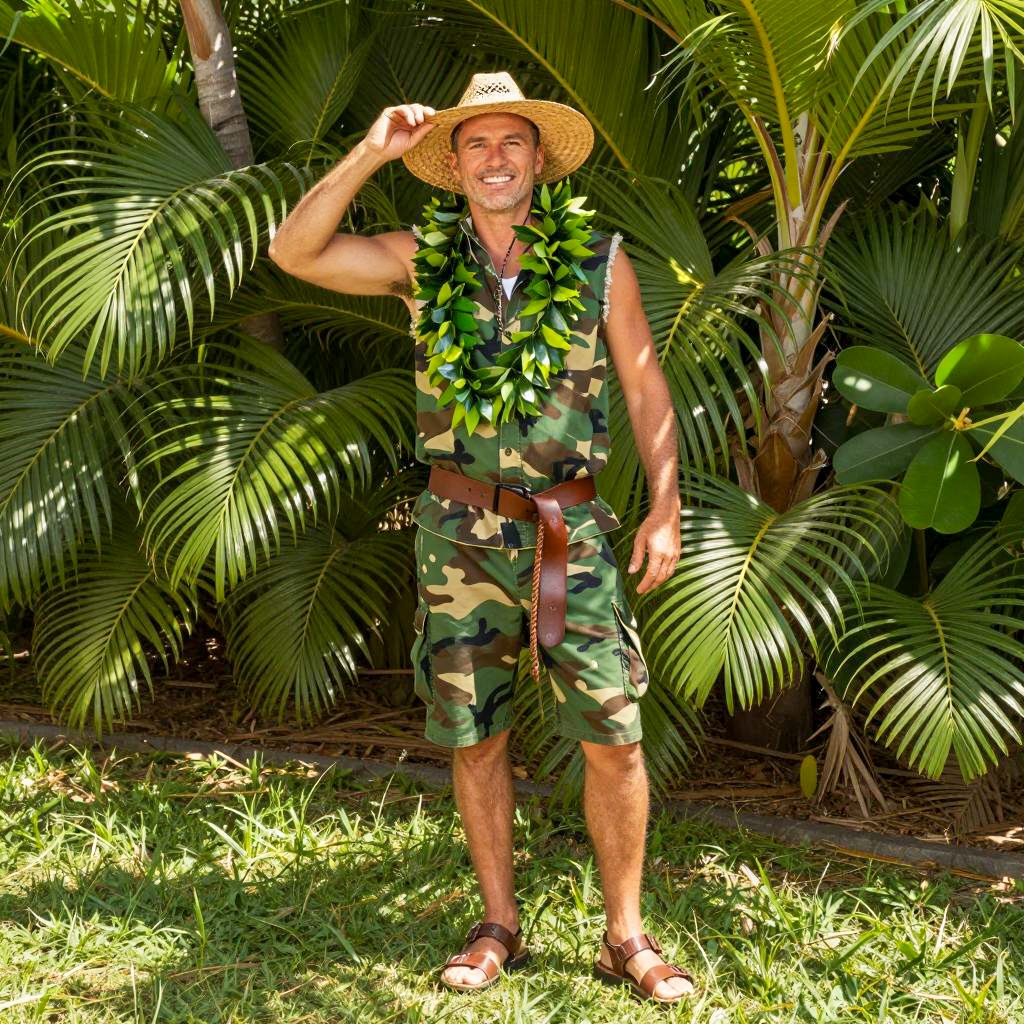 Two men stand outdoors in front of lush green foliage. The man on the left has brown hair, a purple sweatshirt, and a flower crown, holding a pineapple-shaped container. The man on the right has short brown hair, wears an orange shirt, white bandana, and sunglasses, and gestures with his hands. Both men wear necklaces. The man on the right has a serious expression.