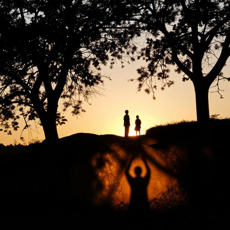 A dramatic scene with light shadow silhouettes against a sunset, capturing the contrast between the bright sky and the dark, outlined figures of trees and rocks.