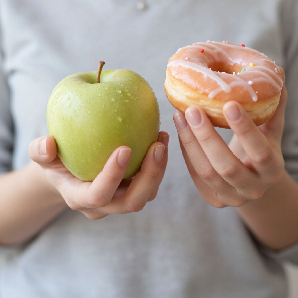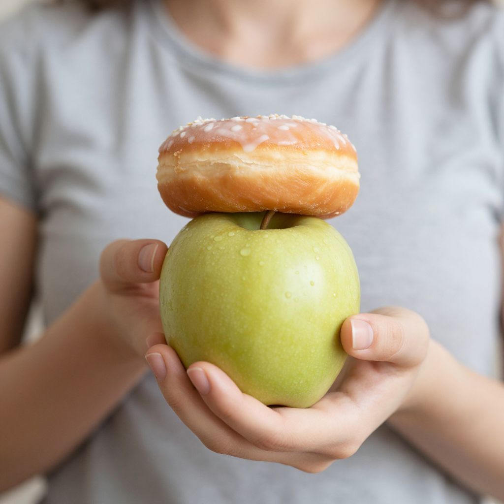 Close-Up of Woman Holding Apple and Doughnut