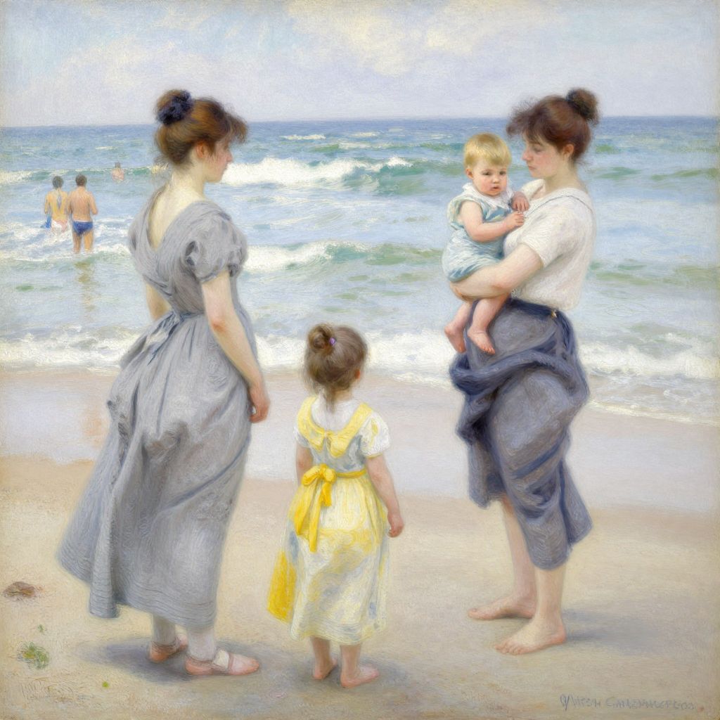 A serene beach scene rendered in a classic impressionist style reminiscent of Pierre-Auguste Renoir, featuring three figures—a woman in a gray dress, a child in a yellow dress, and another woman holding a baby—standing on the sandy shore, with gentle waves and bathers in the background, all captured with soft, natural lighting and vibrant colors characteristic of the medium.