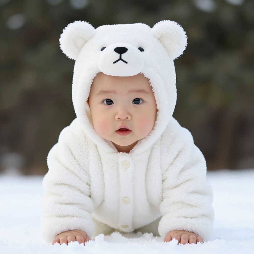 Photograph of a light-skinned baby with round cheeks and wide, dark eyes, wearing a fluffy white bear hood and matching white fleece jacket. The bear hood has small, round ears and a black nose, with a simple, smiling face. The baby is leaning forward with its small hands on a snowy surface, looking directly at the camera. The background is blurred, featuring dark green foliage, which contrasts with the bright white of the baby's outfit. The overall image is crisp and vibrant, highlighting the soft texture of the baby's clothing and the smoothness of its skin.
