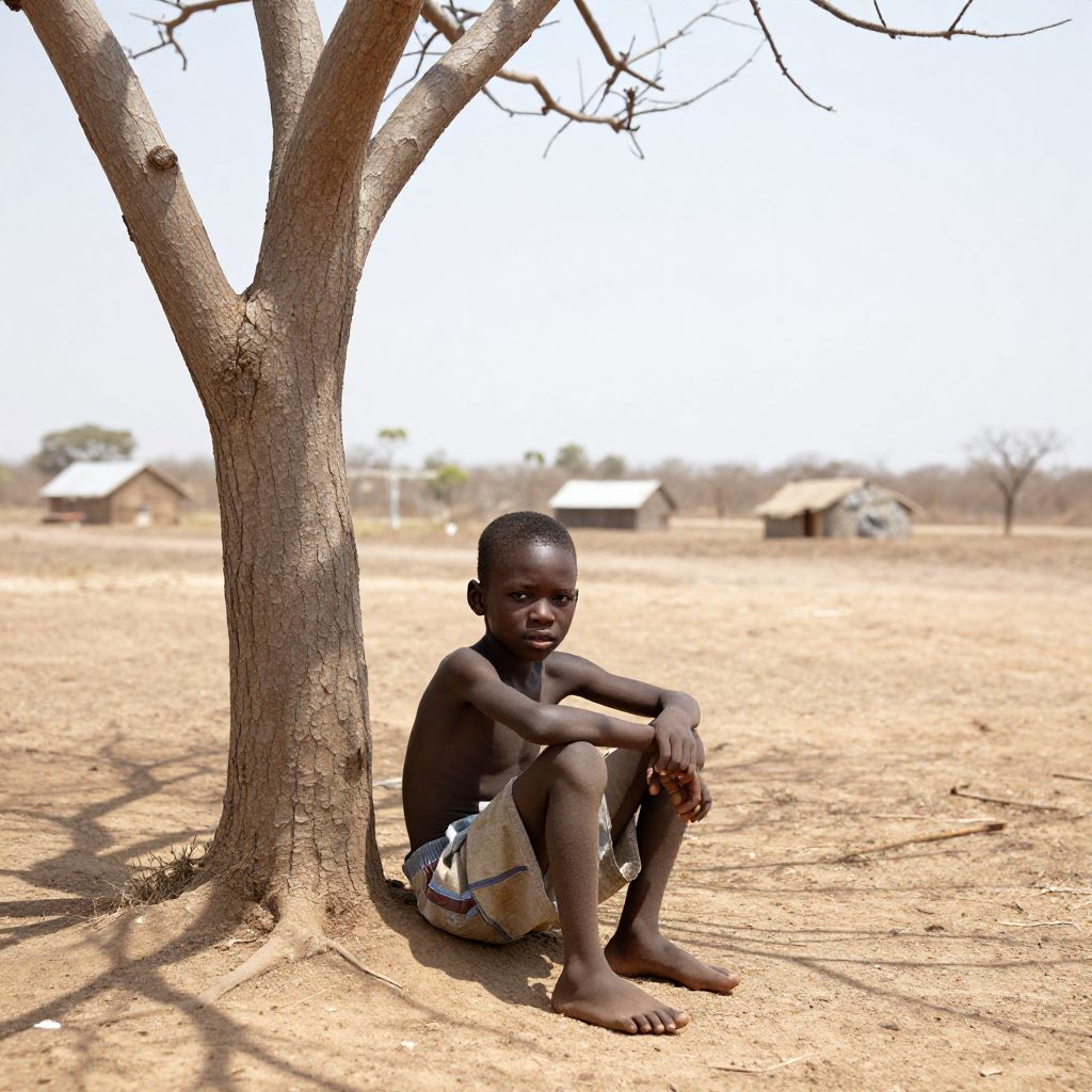 African kid starving sitting alone under a bare tree, emaciated figure, sun-dried landscape with distant huts, muted earthy tones, eyes reflecting struggle and resilience, conveying a powerful message about famine and survival.