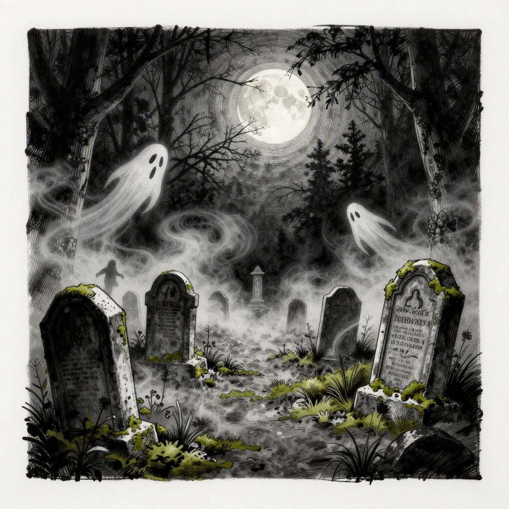 Creepy graveyard drawing showing an ancient burial ground bathed in cold moonlight, eerie mist creeping over moss-covered stones, ghostly wisps floating above the earth, shadowy figures barely visible among the trees, detailed ink sketch style with high contrast.