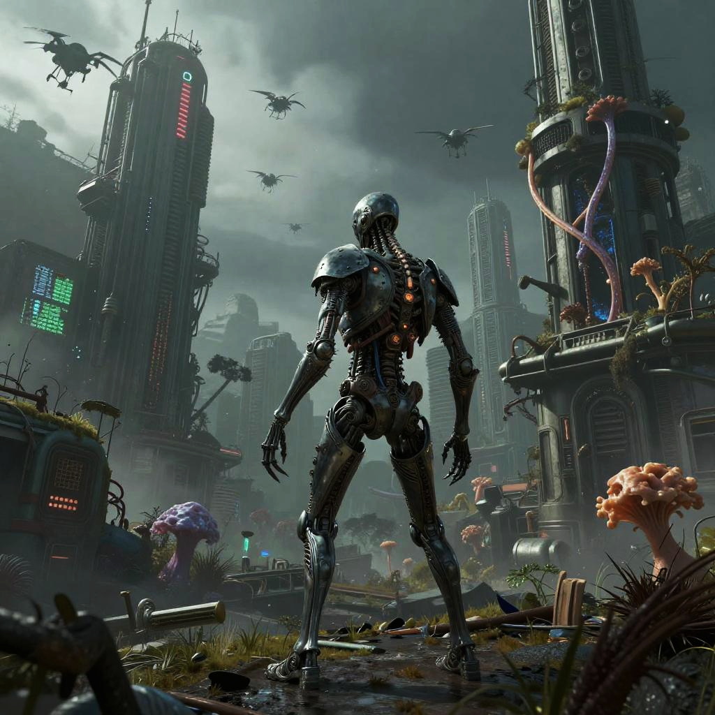 In a decrepit, overgrown metropolis, nomadic splice-smuggler hides among the ruins, their body a fusion of synthetic and organic mutations. Their vascular chitinous scapular plates integrated with pheromone emitters and retractable micro-tentacles shifts in response to danger, a testament to the unchecked experimentation of corporate bioweapon research. Fungal growths sprawl over abandoned biotech facilities, their spores whispering fragmented data to those who can decipher them. Towering over the ruins, bio-mechanical monoliths stand as remnants of failed utopias, their vascular piping still pumping a strange, viscous fluid. In the distance, swarms of gene-spliced drones patrol the skies, scanning for rogue mutations. The atmosphere is humid, spore-streaked neon gloom with a metallic tang of oil and old blood.