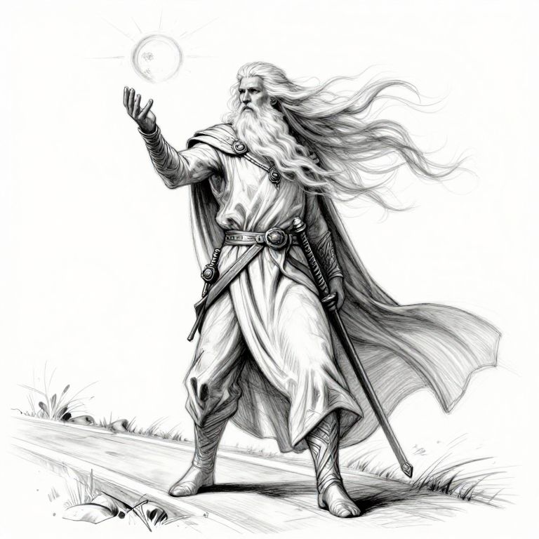A digital black-and-white drawing depicts an imposing, bearded wizard with flowing white hair and a long, billowing cloak. He stands on a grassy path, casting a glowing orb of light with his outstretched right hand. He wears a tunic, belted at the waist, and has a sword sheathed at his side. His left leg is slightly forward, and he wears boots. The background is minimal, emphasizing the wizard's magical gesture and dynamic pose. The artwork uses bold, sketch-like lines, creating a sense of motion and power.