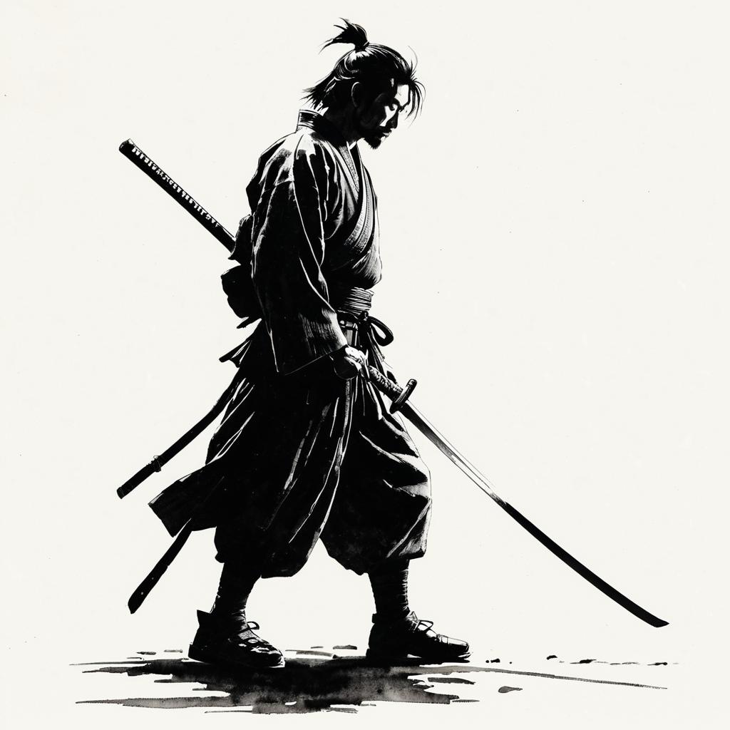 Backlighting ink drawing of a mysterious samurai, full-body view from afar, holding a katana horizontally, rendered in traditional Japanese ink wash, open white background, highly detailed with sharp focus and high contrast.