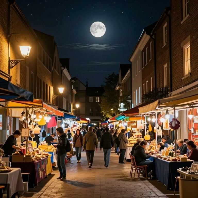 Moonlit streets hum with activity as vibrant market stalls line both sides, illuminated by warm street lamps and glowing windows, while people gather around tables beneath a luminous full moon and starry sky.
