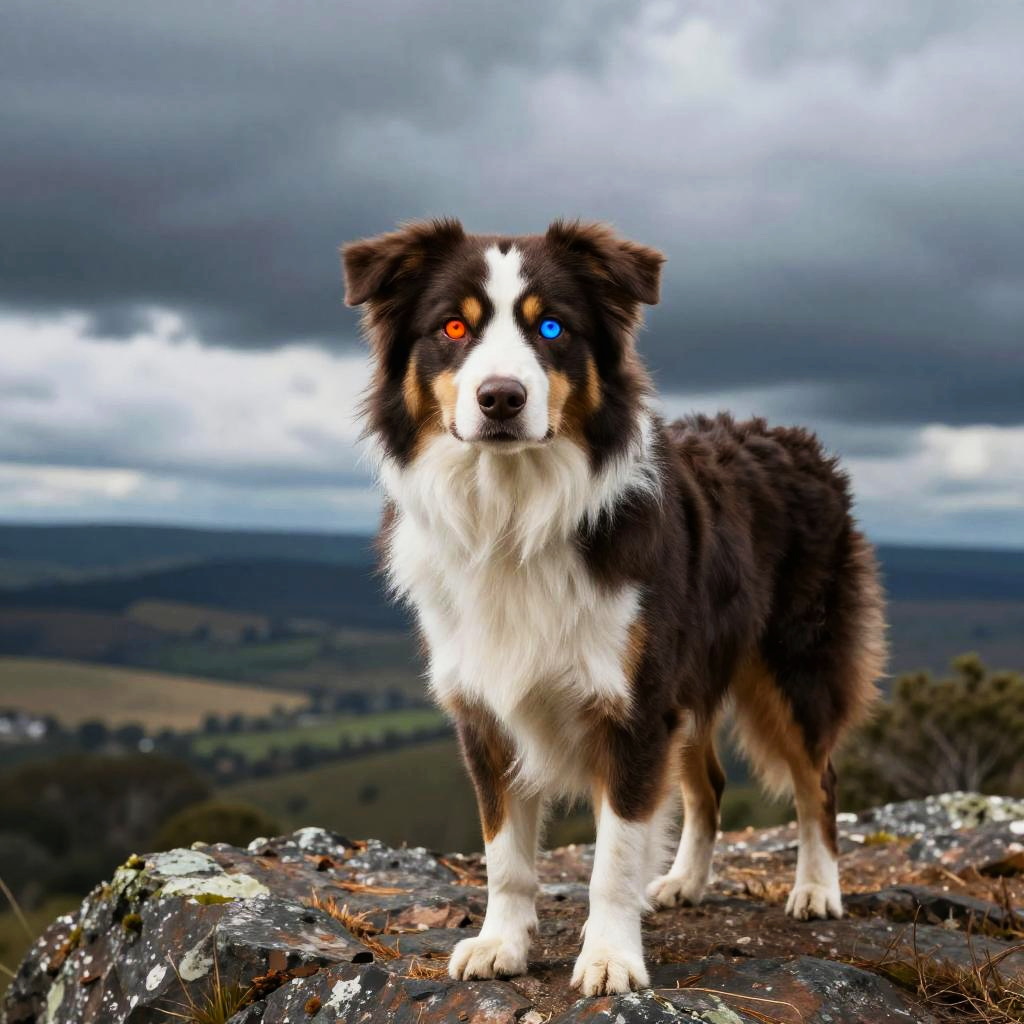 Majestic Australian shepherd heterochromia standing on rocky hilltop, panoramic landscape background, sharp piercing eyes with different colors, dramatic sky, cinematic lighting