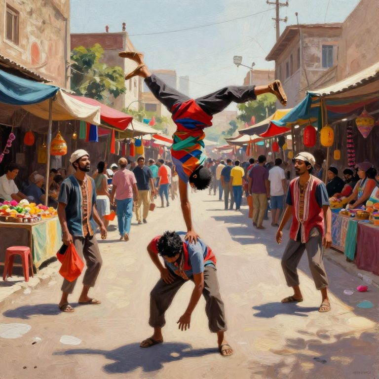 Skibbidi street performers showcasing acrobatic stunts in a bustling urban marketplace, colorful stalls and lively crowds, sunlit afternoon with vibrant shadows, a celebration of culture and movement captured in a painterly style.