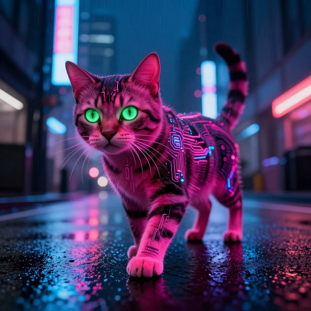 Neon-lit cybercat with glowing green eyes and digital-patterned fur walks on a wet, reflective urban street at night.