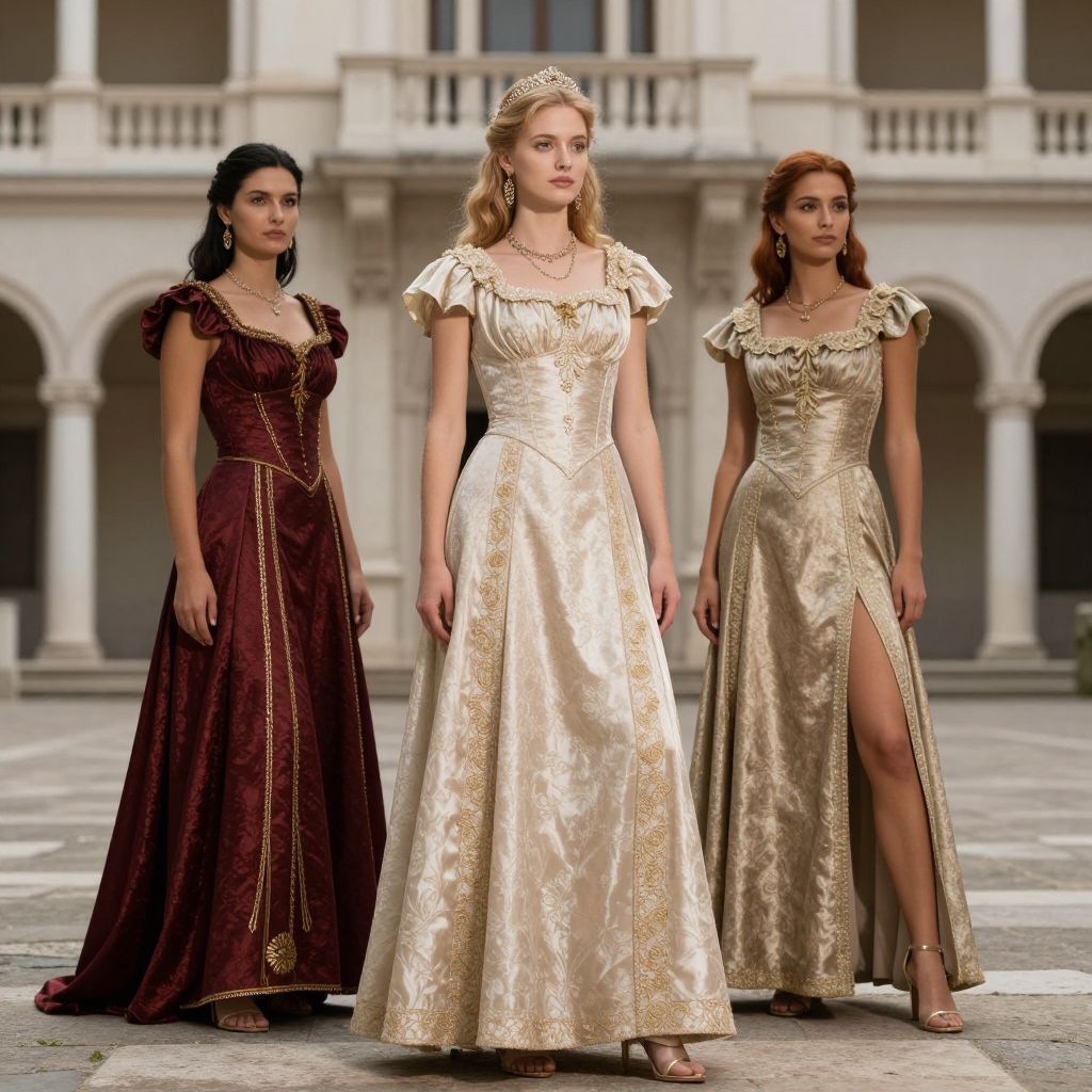 Photograph of three women standing in an outdoor courtyard, wearing elaborate Renaissance-style gowns. The woman in the center has blonde hair, a gold crown, and a cream-colored, embroidered gown with short sleeves and a full skirt. The woman on the left has black hair, wearing a deep maroon gown with gold trim and long sleeves. The woman on the right has auburn hair, wearing a gold gown with a high slit, short sleeves, and a gold necklace. The background features a classical building with white columns and arches. The women's gowns have intricate patterns, and they stand on a stone-paved ground.