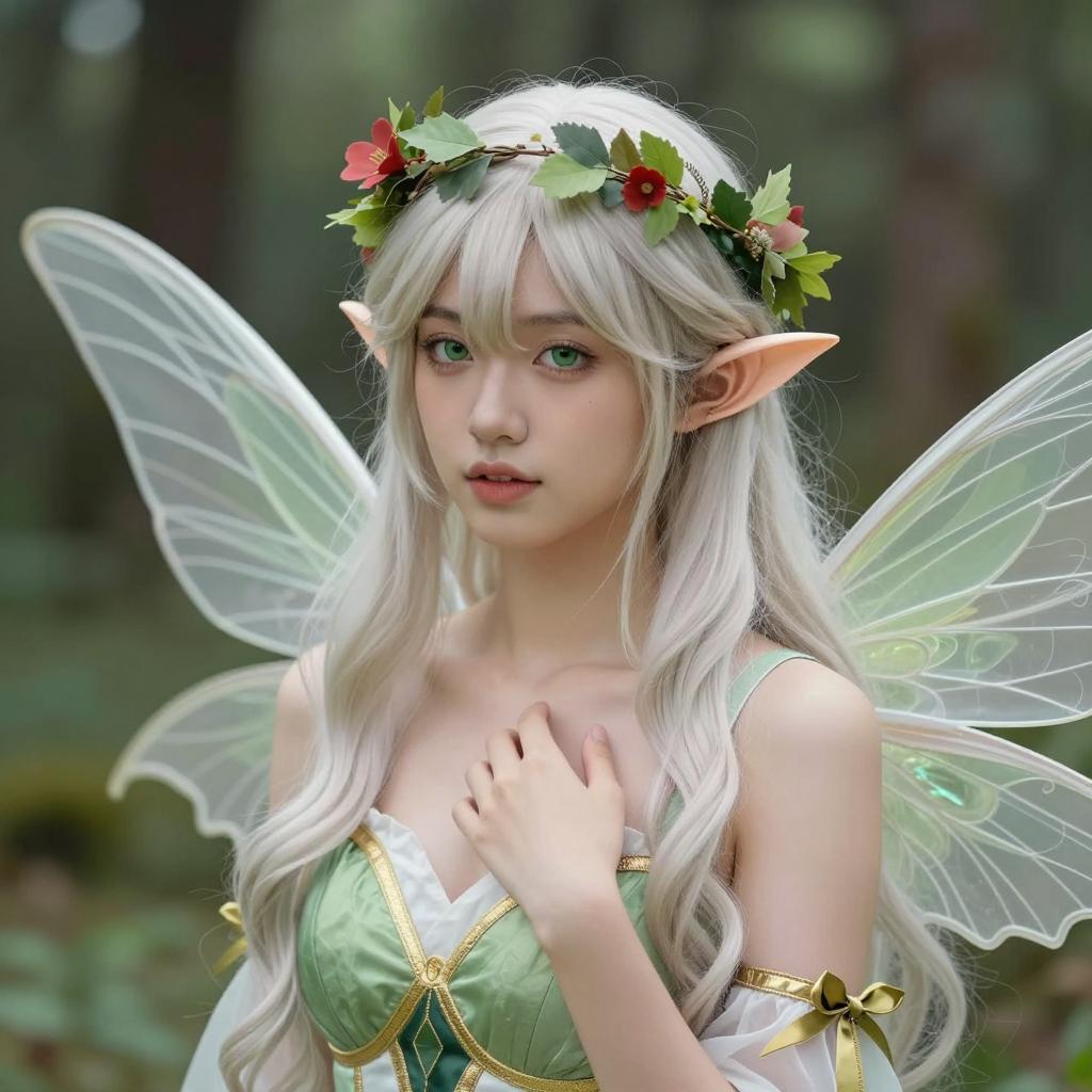 Elf fairy cosplay, photo-realistic portrait of a beautiful young fairy woman with long, wavy platinum blonde hair, wearing a green and white elf costume with gold trim, adorned with a flower crown of red and green leaves, delicate translucent fairy wings, elf ears, green eyes, soft light makeup, forest background, natural light, close-up, hand near chest, ethereal, fantasy, magical, realistic CGI, detailed ures, serene expression, soft focus background.