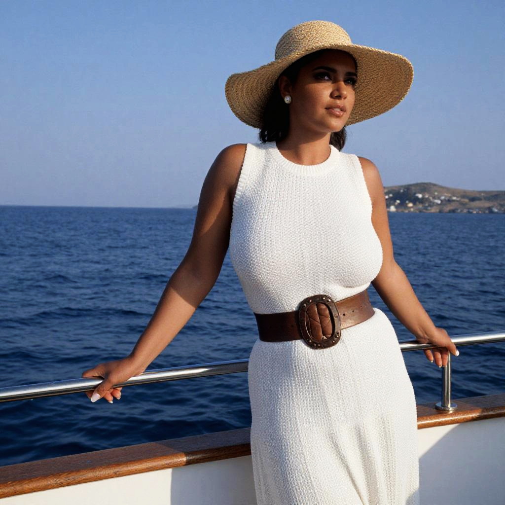 A Stocky woman in summer attire, wearing a white sleeveless knit top and a high-waisted white maxi skirt, complemented by a wide brown belt and a straw hat with a wide brim, standing in a luxury boat in the Greek Islands. Visual style: kodachrome analog film. Sexy. Pretty face and beаutiful eyes. Big breasts
