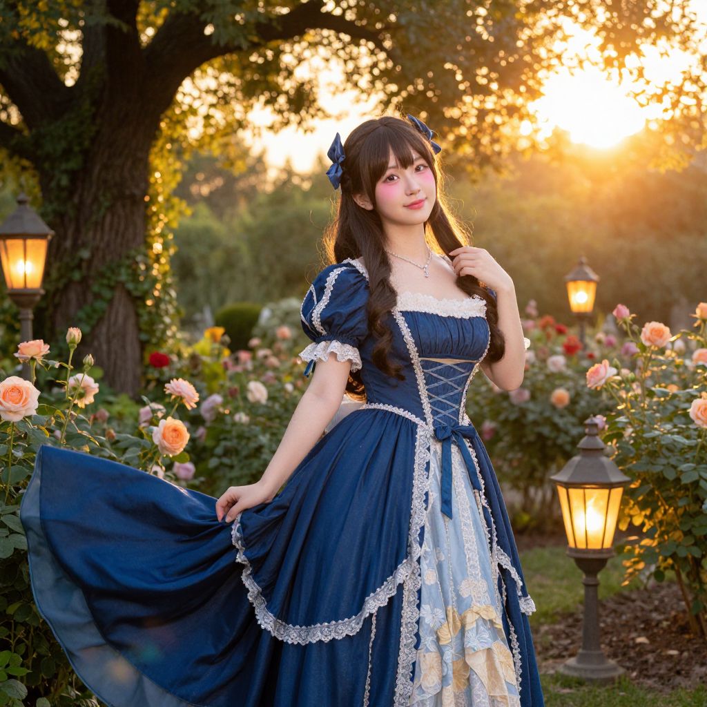 A young woman in a very pretty dress and elegant costume, posing in a fairy-tale garden at sunset, the dress is deep blue with lace trim and a flowing train, her face is soft and radiant with warm pink cheeks and a serene smile, golden light filters through the trees, the background features blooming roses and glowing lanterns.. The woman has big tits and cute face