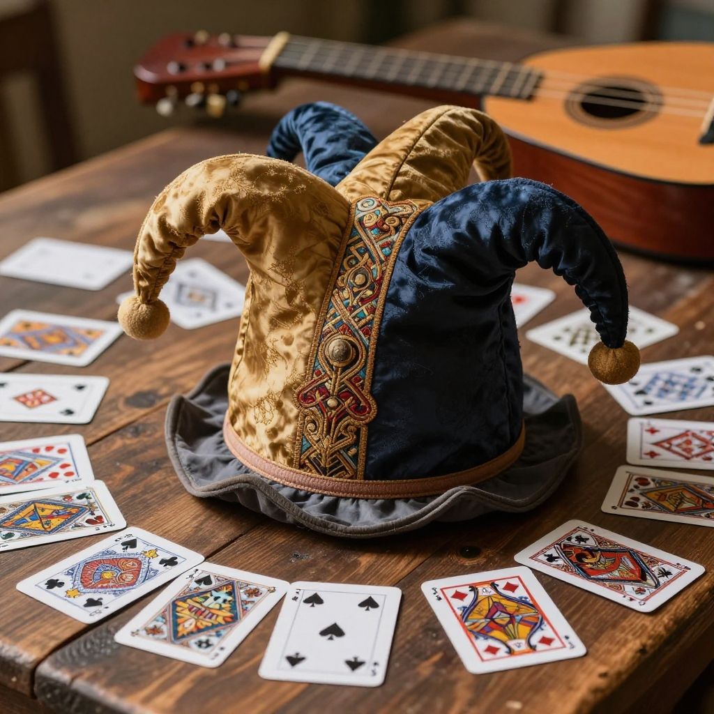 A medieval jester hat resting on an old wooden table scattered with colorful playing cards and a lute, soft natural light highlighting the curved tips and ornate patterns embroidered on the hat