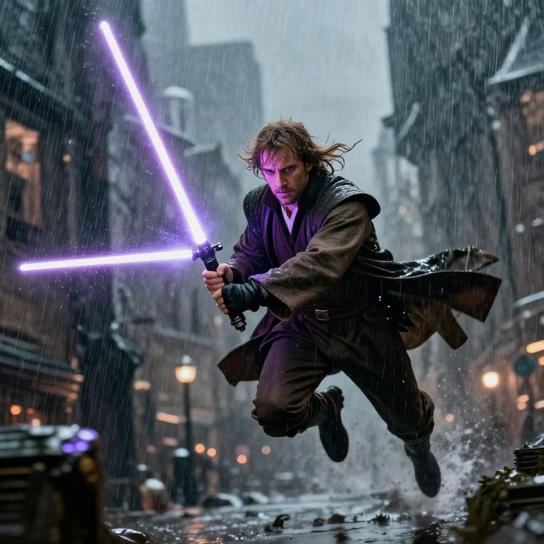 A realistic cinematic shot of a male Jedi warrior wielding a purple double-bladed lightsaber, captured mid-air as he leaps through a rainy city street. The character wears traditional dark Jedi robes with gloves, set against a blurred urban background with streetlights reflecting in the wet environment, emphasizing dynamic lighting and action.