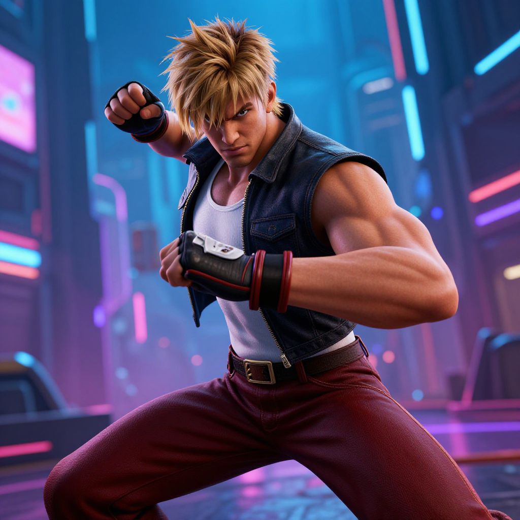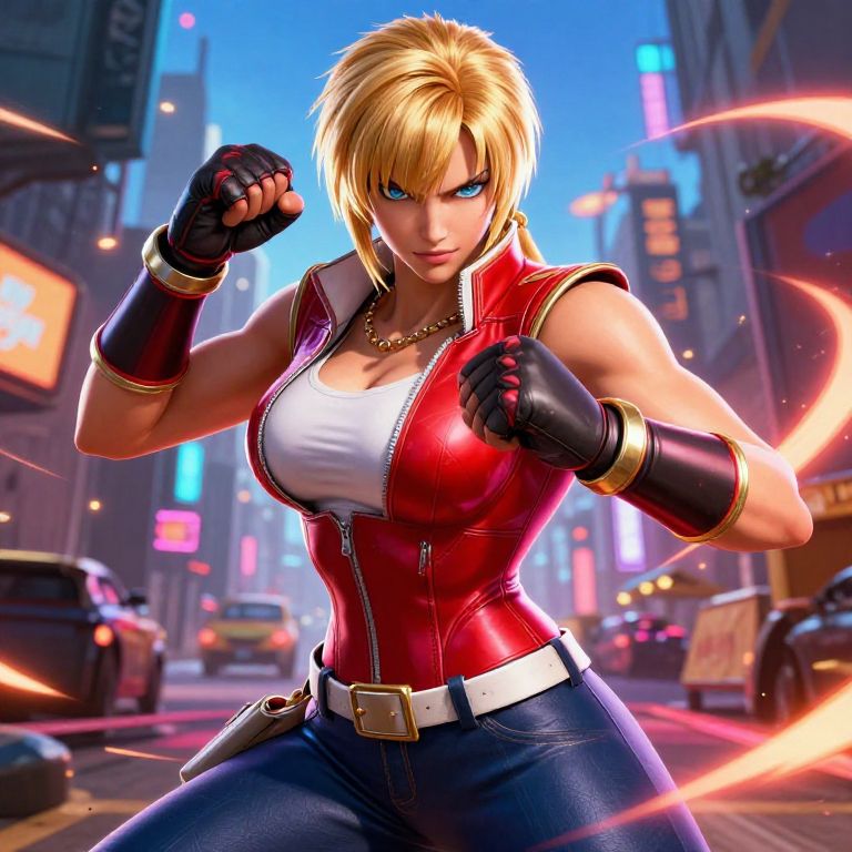 Street Fighter 6 characters Manon ready for combat, detailed close-up, stylized artwork, high contrast colors, energetic city street scene, glowing effects on outfit and weapons