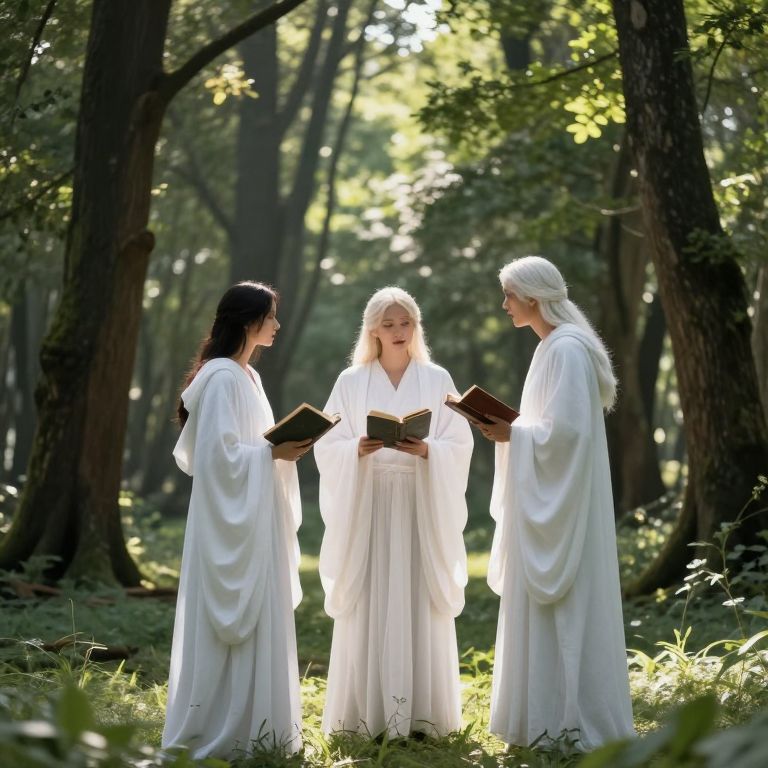 Three ethereal figures in flowing white robes stand amidst a sunlit forest glade, each holding ancient books as they engage in quiet conversation, surrounded by towering trees and dappled sunlight filtering through the canopy.