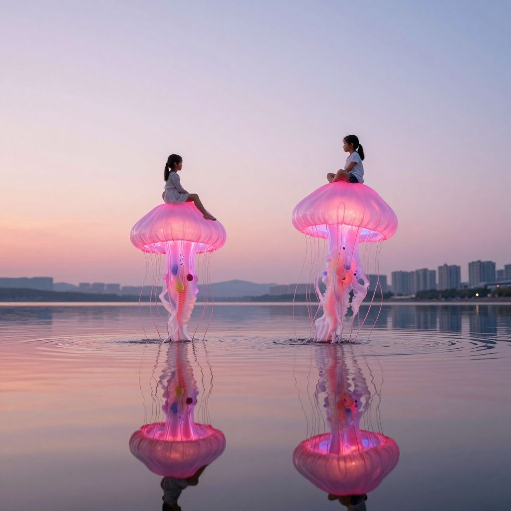 Children perch atop two giant pink jellyfish, gracefully gliding over a serene, mirror-like water surface that perfectly reflects the vibrant sky and distant cityscape.