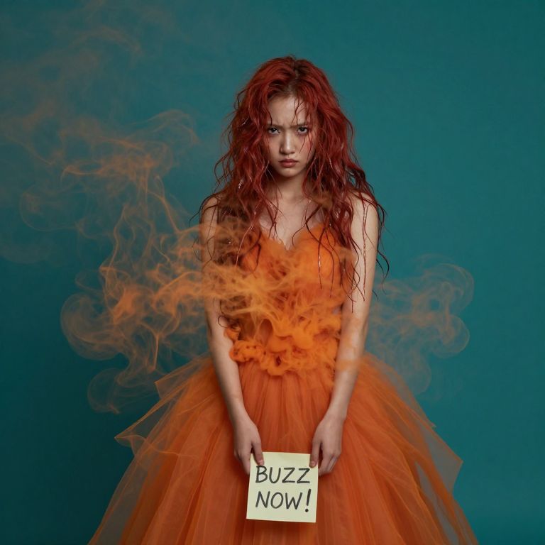 \"minimal soft studio light photography of a east asian girl with a messy wavy long hair and appears to be wet, red and dripping, dressed in a gown made of orange smoke, she looked at the camera with a angry look, her hand hold a note with text \\"BUZZ NOW!\\", A surreal, abstract portrait with swirling, ethereal teal and dark orange colors of smoke, creating a dreamlike and mystical atmosphere, solid bold color background\