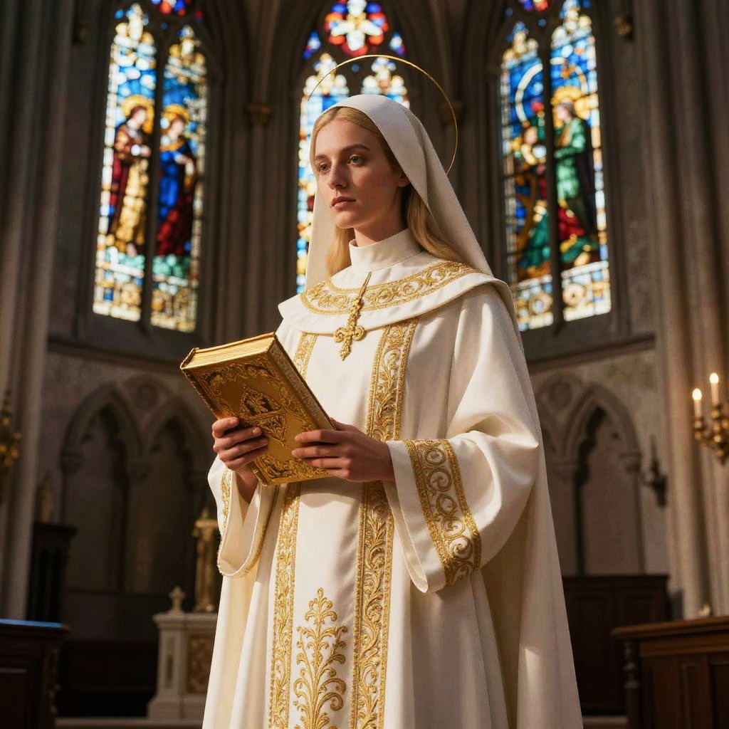Photograph of a fair-skinned woman with long, wavy brown hair and closed eyes, wearing a white, long-sleeved, embroidered blouse and a white veil. A glowing, halo-like circle hovers above her head. She stands in a dimly lit church with two stained glass windows in the background depicting religious figures in colorful robes. The stained glass windows are arched and framed by dark stone, adding a solemn, sacred atmosphere to the image. The woman's expression is serene and contemplative, emphasizing the spiritual setting.