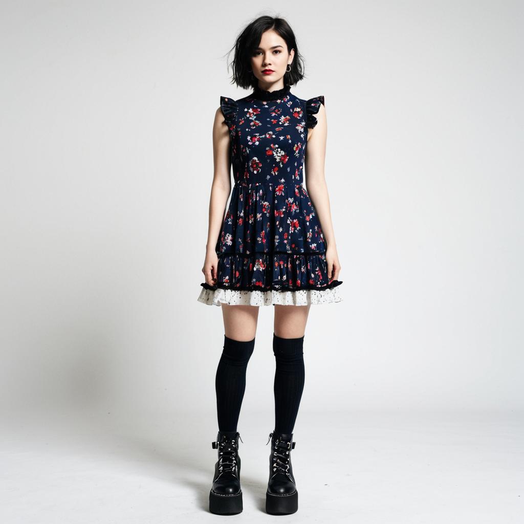 Woman, casual punk-inspired, sleeveless mini dress in dark navy with red and white floral print, high ruffled neckline, flared hem, black lace trim, chunky black platform boots, sheer black ankle socks, white background.