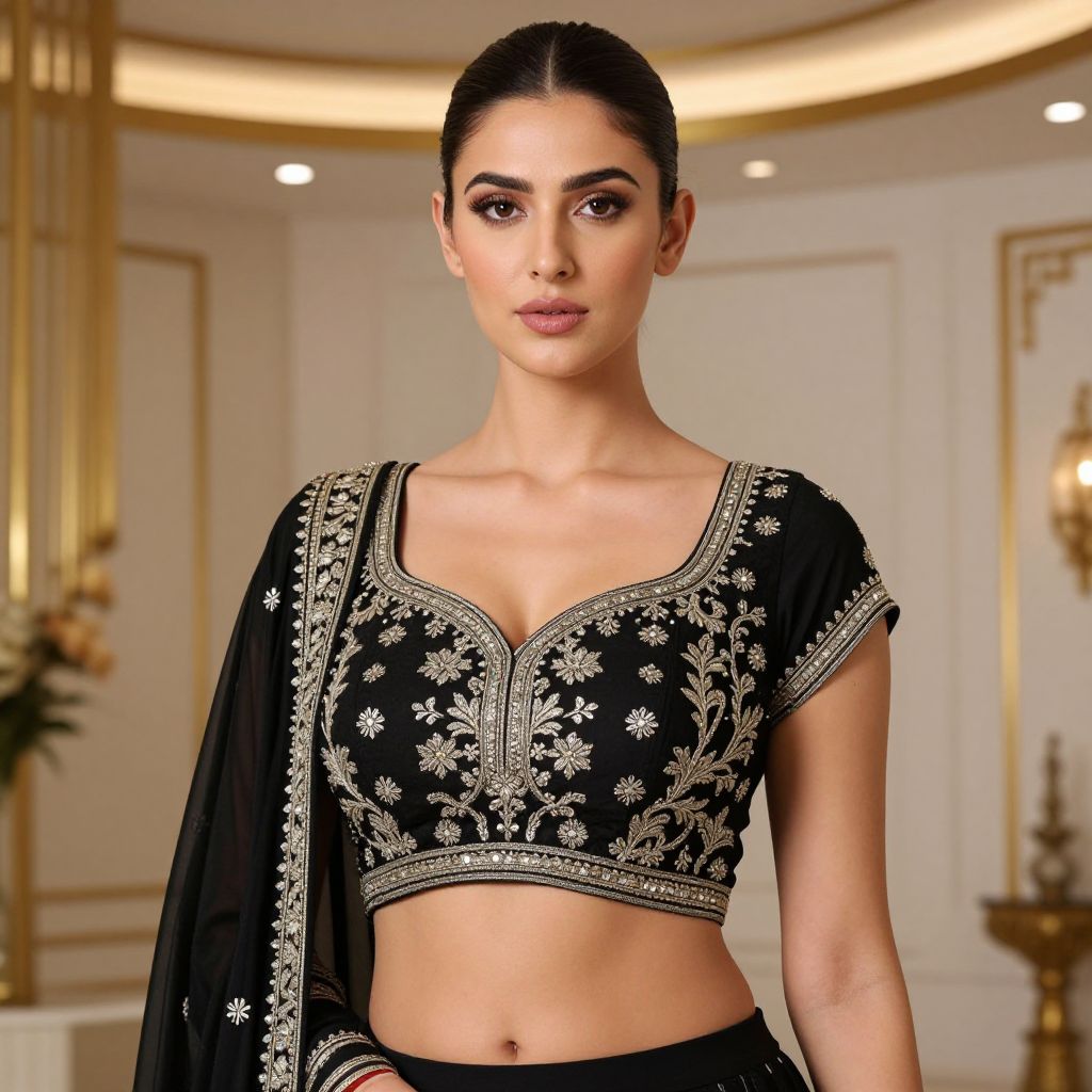 Photorealistic close-up of a tall, elegant woman with fair skin and defined features wearing a detailed black ghagra costume with silver embroidery, standing confidently in a modern Indian wedding hall with gold decor and soft lighting casting gentle shadows.. The woman has big breasts and cute face