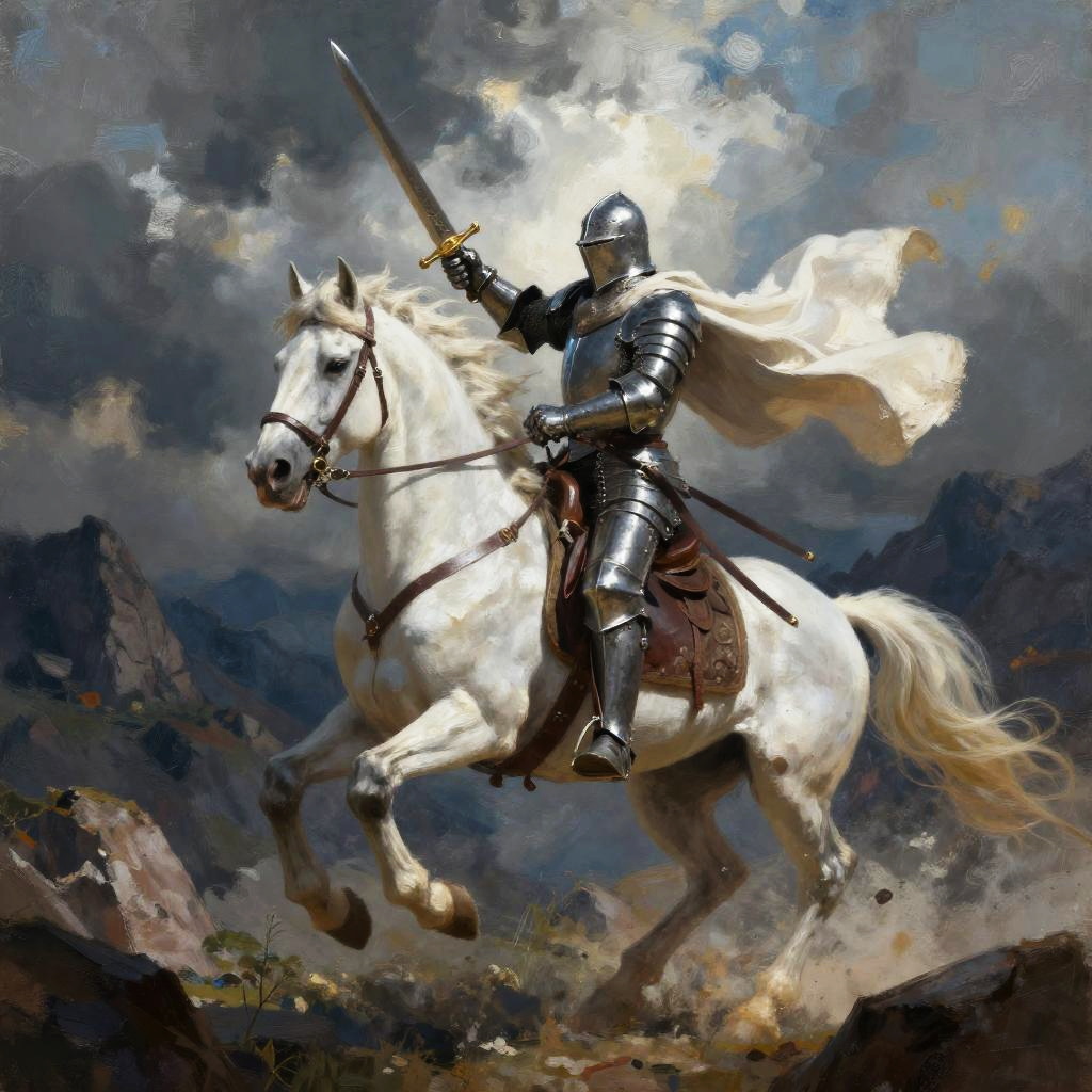 A dramatic digital painting of a armored knight riding a powerful white horse, charging through a rugged mountain landscape. The knight, clad in detailed, metallic armor, wields a large sword in his right hand and has a flowing white cape billowing behind him. The sky is filled with dynamic, stormy clouds, casting dramatic shadows over the rocky terrain. The scene exudes a sense of epic adventure and bravery.