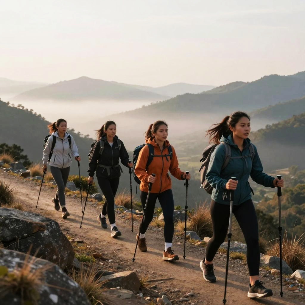 Woman Hiking on Rocky Mountain Trail with Umbrella