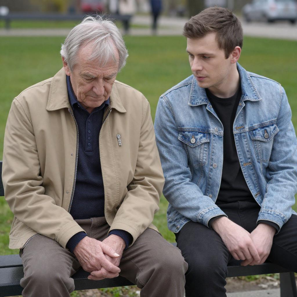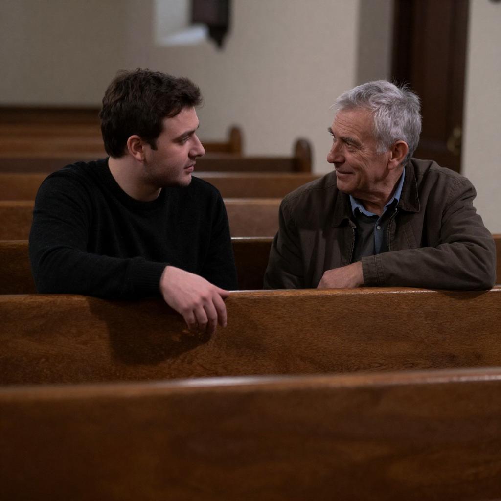 Photograph of two men in a dimly lit church with wooden pews. The man on the left, with short dark hair and a black sweater, leans forward with his arm on a pew, looking at the older man on the right, who has gray hair, a brown jacket, and a slight smile. They are engaged in conversation.