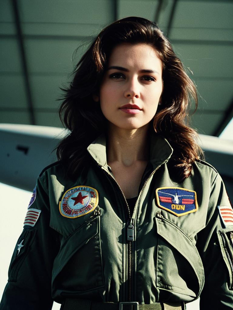 Woman in Top Gun costume, waist-up editorial photo, photorealistic tones
