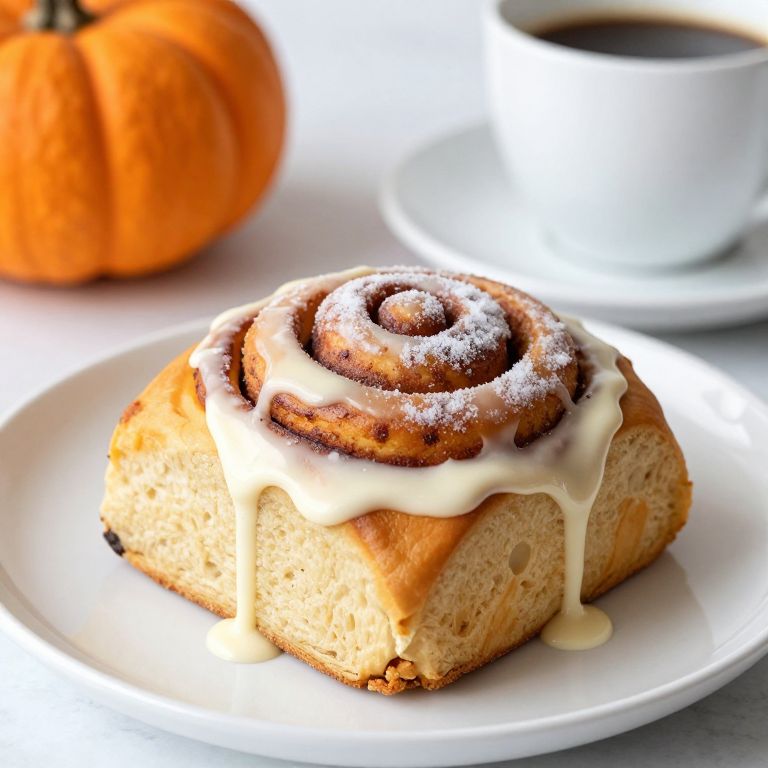 Frosted pumpkin spice cinnamon roll, generously drizzled with creamy glaze, rests on a pristine white plate, accompanied by a blurred coffee cup in the background and a vibrant orange pumpkin peeking from the top left corner.