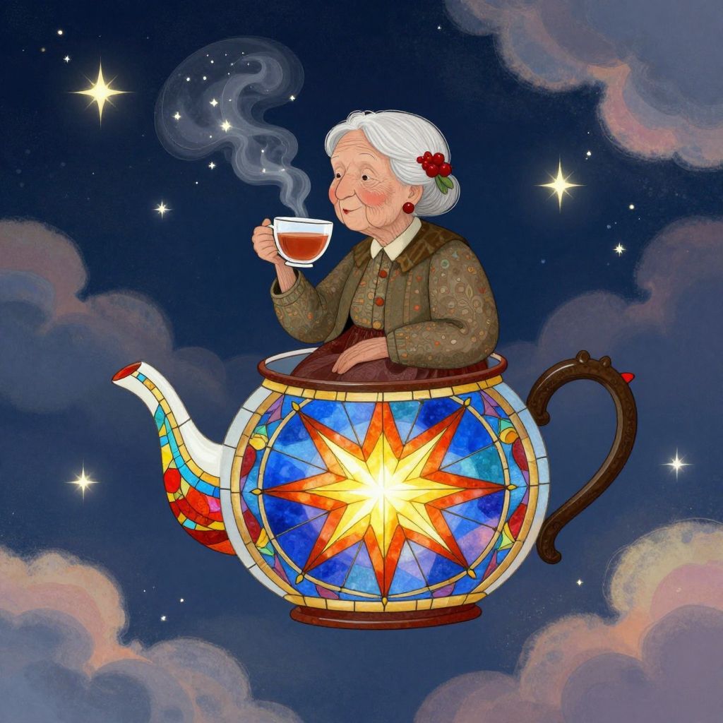 A whimsical digital illustration depicts an elderly woman with white hair adorned with red berries, perched inside a fantastical, airborne teapot adorned with intricate stained-glass patterns and a vibrant starburst design, sipping tea as it steams with sparkles of captured starlight against a dreamy night sky filled with clouds and twinkling stars.
