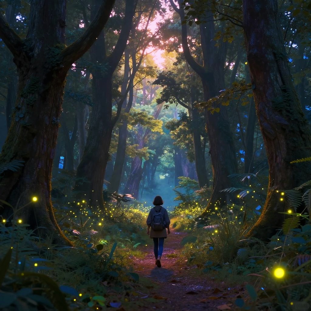 Liliputienses traveling through a mystical forest path illuminated by fireflies, with towering ancient trees and bioluminescent plants, dreamy and atmospheric, fantasy realism style, intricate environmental details, gentle glowing accents